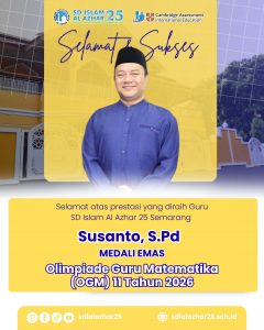 Adalah Susanto, S.Pd, yang sukses meraih Medali Emas Olimpiade Guru Matematika tingkat SD (OGM) ke-11 Tahun 2026. Prestasi ini menjadi bukti nyata kualitas tenaga pendidik unggul yang dimiliki oleh SD Islam Al Azhar 25 Semarang.